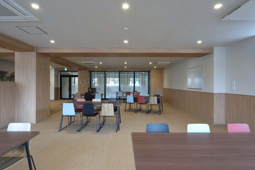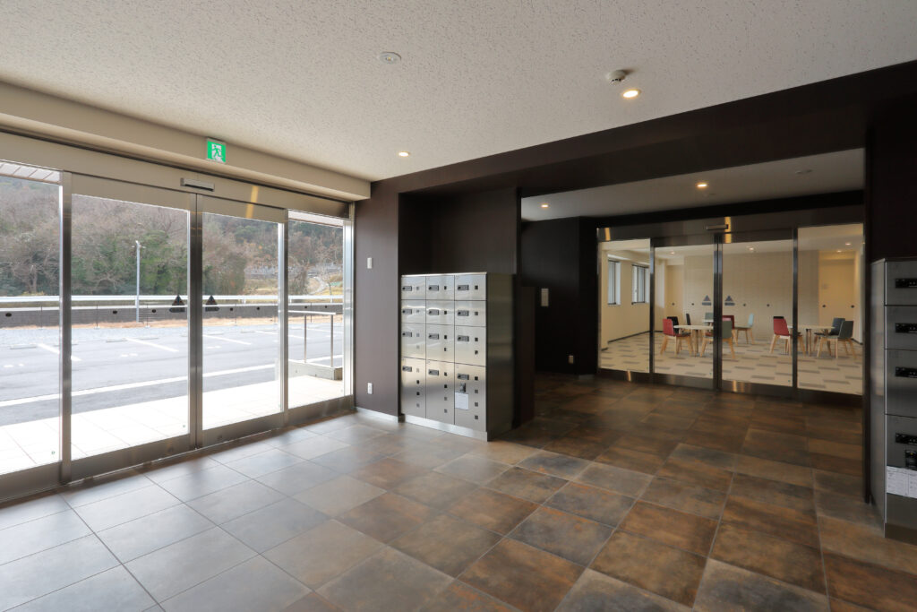 岡山工場周辺に勤務する社員のための殿土井寮は2022年に竣工した最新の独身寮で、駐車場や屋根付き駐輪場、宅配ボックスも完備し、オートロック付きの玄関に敷地内のごみステーションなど、便利に暮らすためのサービスが充実しています。